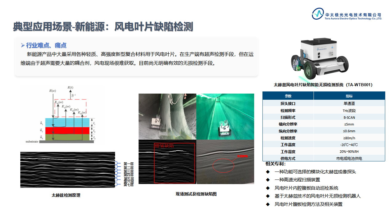 行业难点、痛点:新能源领域广泛采用轻质、高强度且多样化的新型复合材料,然而,针对风电叶片在生产制造及运维过程中增强玻璃纤维材料内部潜在的缺陷问题,目前行业内尚缺乏一种明确且高效的无损检测技术手段,这成为了制约行业发展的一大瓶颈。